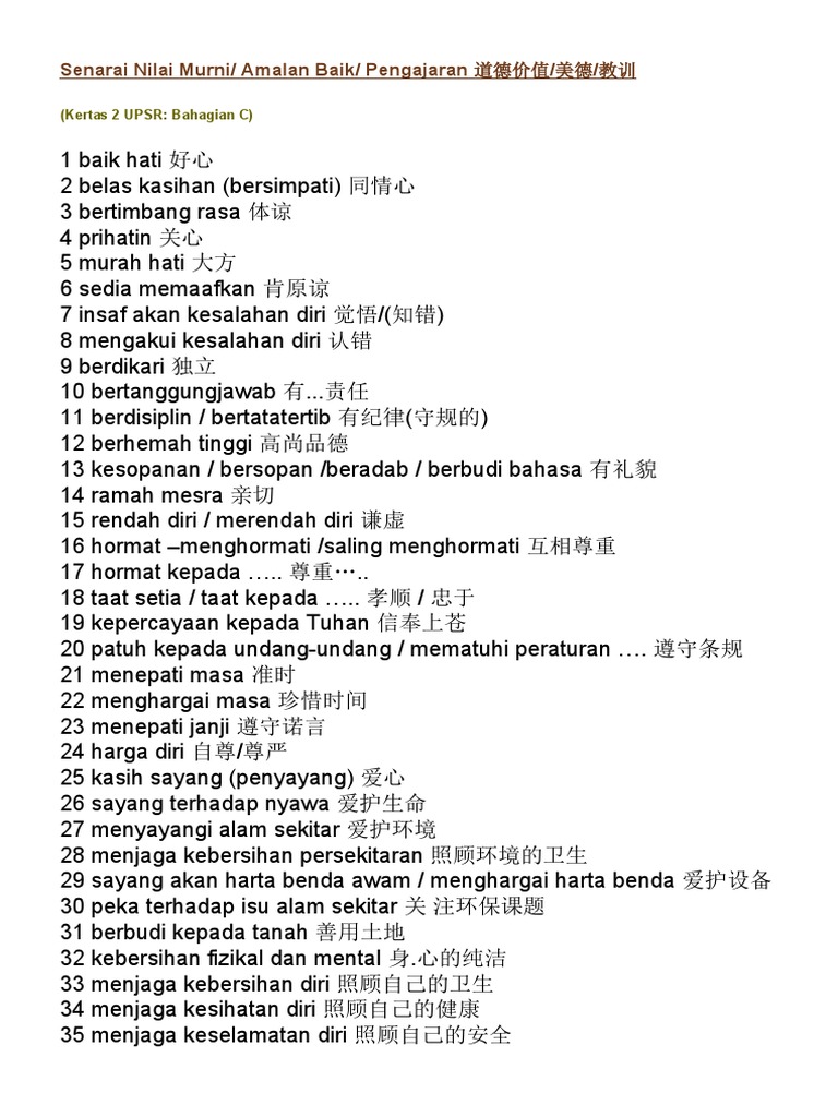 Nilai Murni Spm : Upsr Bm Bhg C Nilai Nilai Murni : Senarai nilai moral pendidikan moral spm sijil pelajaran malaysia.. Nilai nilai murni moral spm. Semoga perkongsian bahan bahan rujukan panduan bahan pembelajaran dan pengajaran contoh contoh karangan sumber rujukan spm sijil pelajaran malaysia tingkatan 4 tingkatan 5 dalam post di blog bumi gemilang berguna dan dapat membantu para pelajar dan pengguna. 1 anda harus mempunyai senarai semua 36 nilai dalam silibus dan definisi dan kata kunci mereka. 22% menganggap dokumen ini tidak bermanfaat, tandai dokumen ini sebagai tidak bermanfaat. Kata kata hikmah islam dalam bahasa inggris kata kata hikmah pagi kata kata motivasi kejayaan pelajar kata kata hikmah tentang ilmu kata kata hikmah english pendek kata kata kejayaan kata kata motivasi pendidikan dari tokoh dunia kata kata hikmah untuk keluarga bahagia.